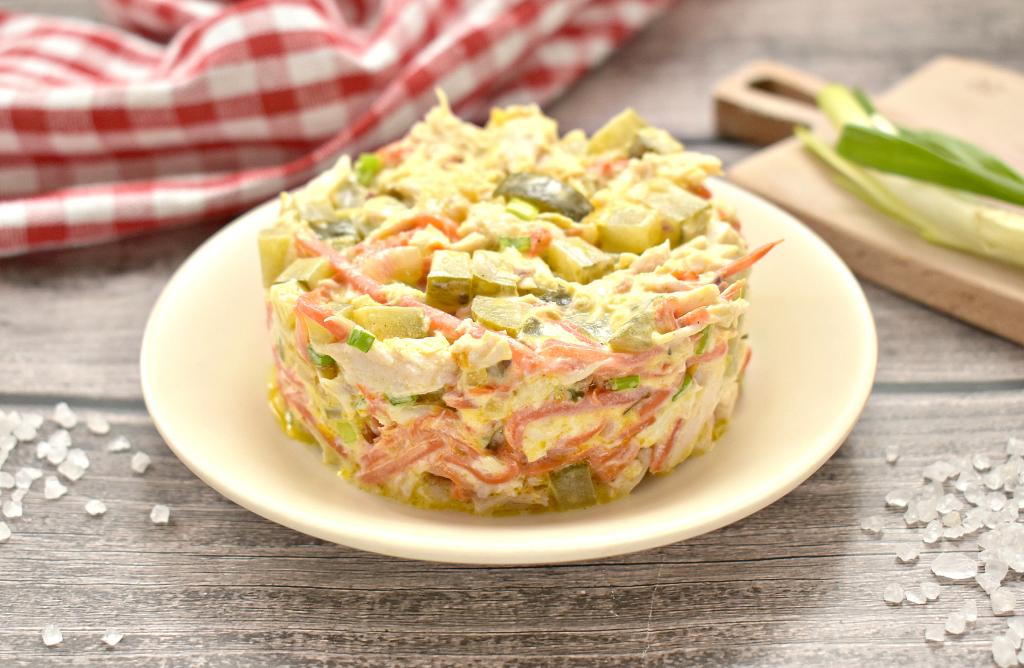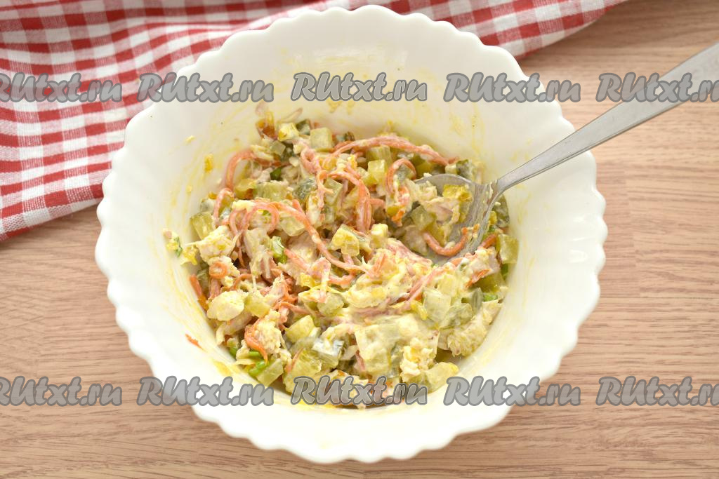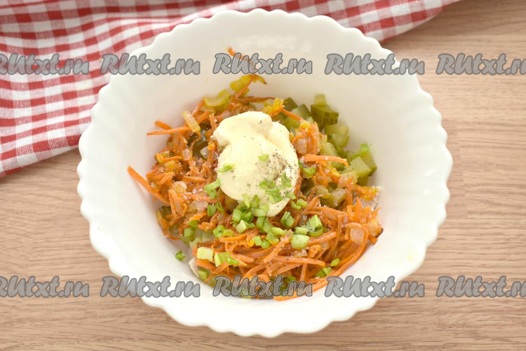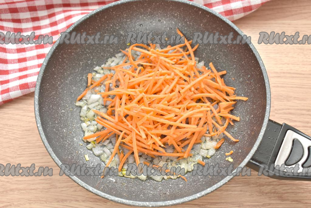 Очищаем морковку, натираем на тёрке. Для этого салата лучше натирать морковку на тёрке для моркови по-корейски. Выкладываем натёртую морковку к луку. Сковороду накрываем крышкой и обжариваем овощи около 5 минут, периодически перемешивая. Морковка должна стать мягкой. Обжаренные овощи, убрав с огня, остужаем.