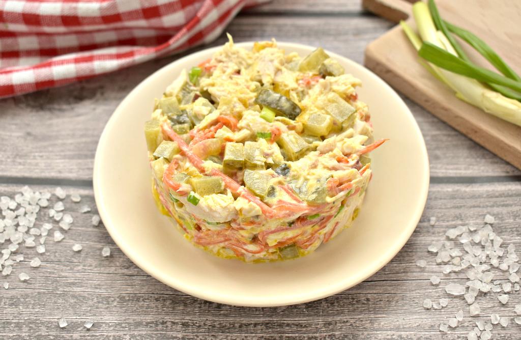 Зелёный лук мелко нарезаем, добавляем в салат, перчим, немного солим и заправляем майонезом, перемешиваем.