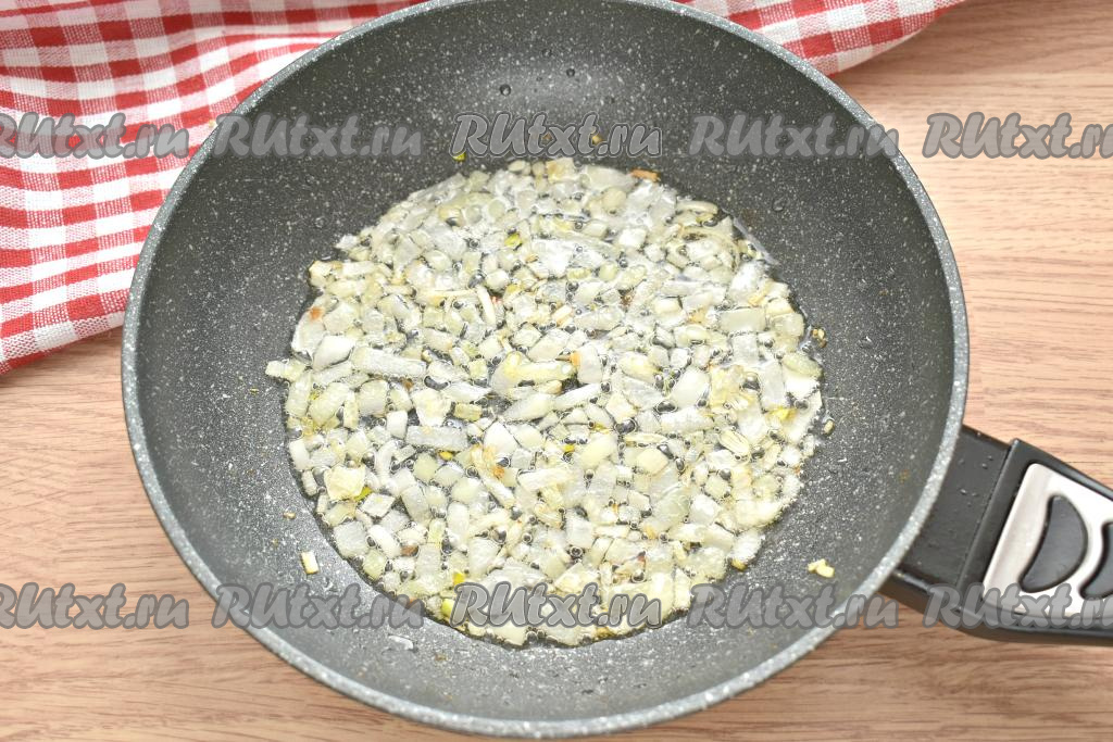 Заранее отвариваем куриное филе (у меня на варку ушло 30 минут после закипания воды), даём ему остыть. Зелёный лук промываем водой. Очищаем репчатый лук, нарезаем его на средние кусочки. На сковороду вливаем растительное масло и прогреваем его. Перекладываем на сковороду нарезанный лук и, периодически перемешивая, обжариваем его минуты 3 (до мягкости) на среднем огне.