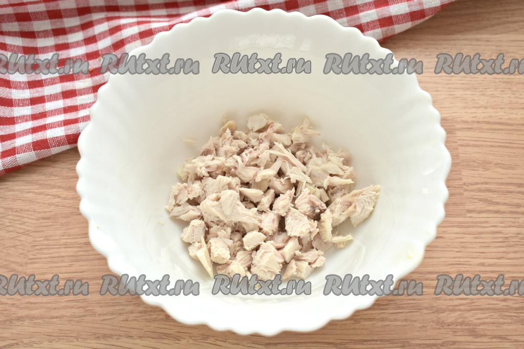 Нарезаем куриное мясо на небольшие кубики, перекладываем в миску.