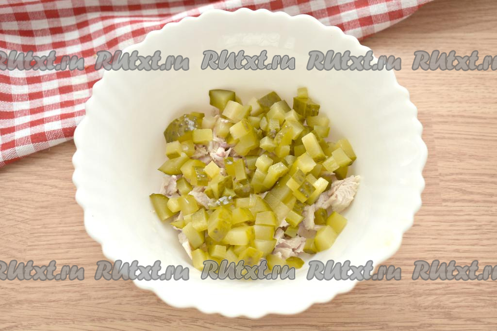 К нарезанному мясу добавляем солёные огурцы, нарезанные на небольшие кубики.