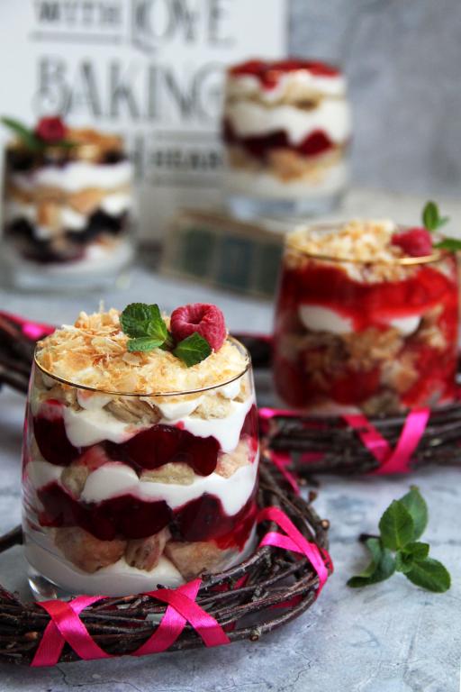 Для формирования десерта взять стаканчики (я взяла 5 штук) и начать выкладывать слоями: часть крема, часть квадратиков из слоёного теста, часть ягодного конфи (я клубничное конфи разложила по 3 стаканчикам, а вишнёвое конфи - по 2 стаканчикам) и часть ягод (у меня - малина и черника). Повторять слои, пока стаканы не будут заполнены. Количество слоёв зависит от высоты стаканчиков. Пару квадратиков из слоёного теста раскрошить и украсить верх десерта. Готовый ягодный трайфл поставить в холодильник на пару часов.