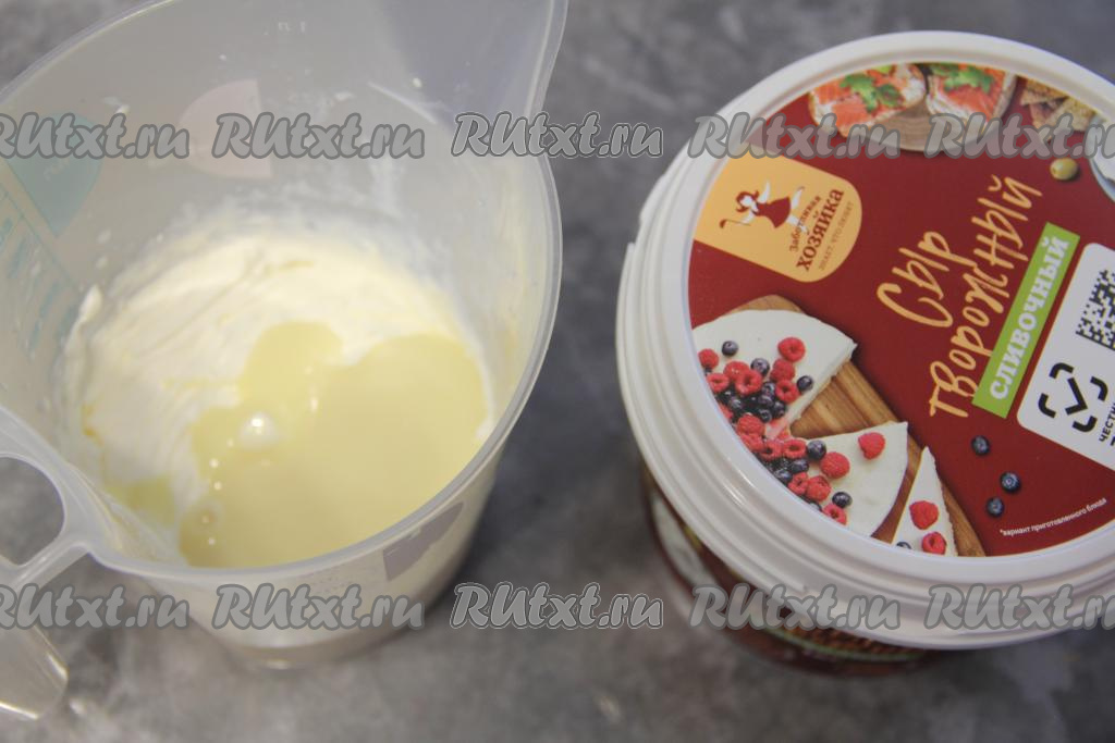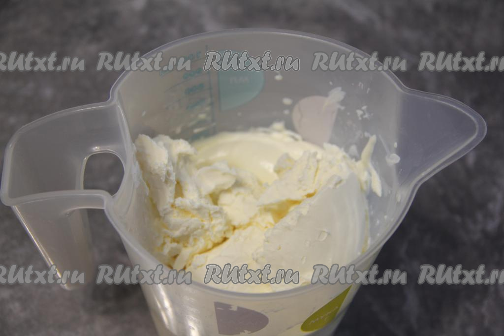 Сливки для приготовления крема нужно хорошо охладить. Переложить сливки в ёмкость, удобную для взбивания. Взбить сливки миксером до мягких пиков, затем добавить сгущёнку и творожный сыр.