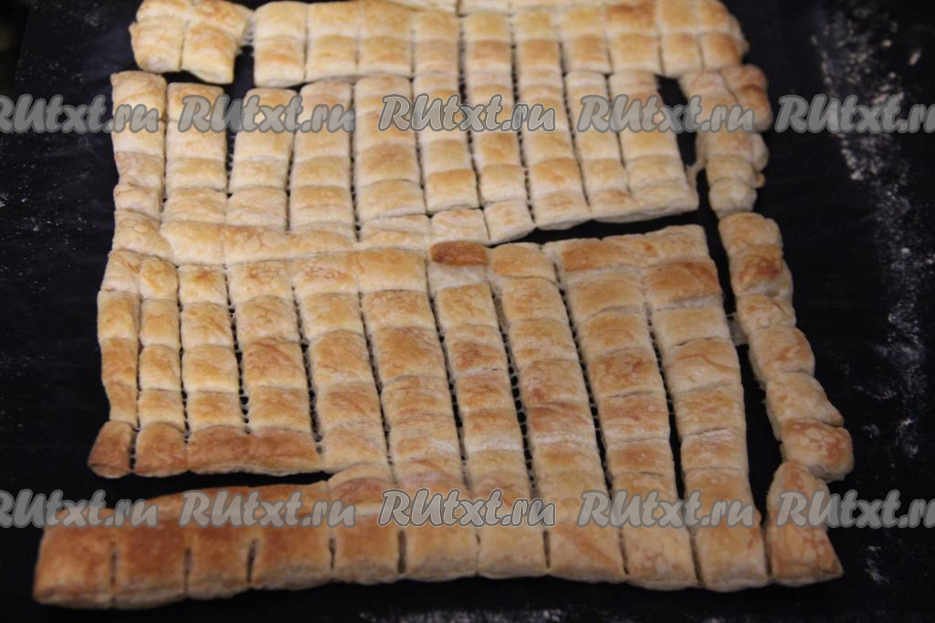 Размороженное тесто переложить на пергамент (или коврик для выпечки) и слегка раскатать. Затем нарезать на квадратики размером 1 сантиметр на 1 сантиметр. Поставить противень в разогретую духовку и выпекать слоёные квадратики минут 10-15 при температуре 200 градусов (до золотистого цвета). Затем квадратики из слоёного теста достать из духовки и полностью остудить.