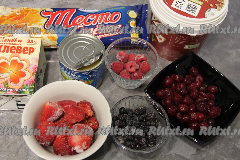Подготовить продукты. Разморозить слоёное тесто при комнатной температуре. Пока тесто размораживается, можно приготовить вишнёвое и клубничное конфи.