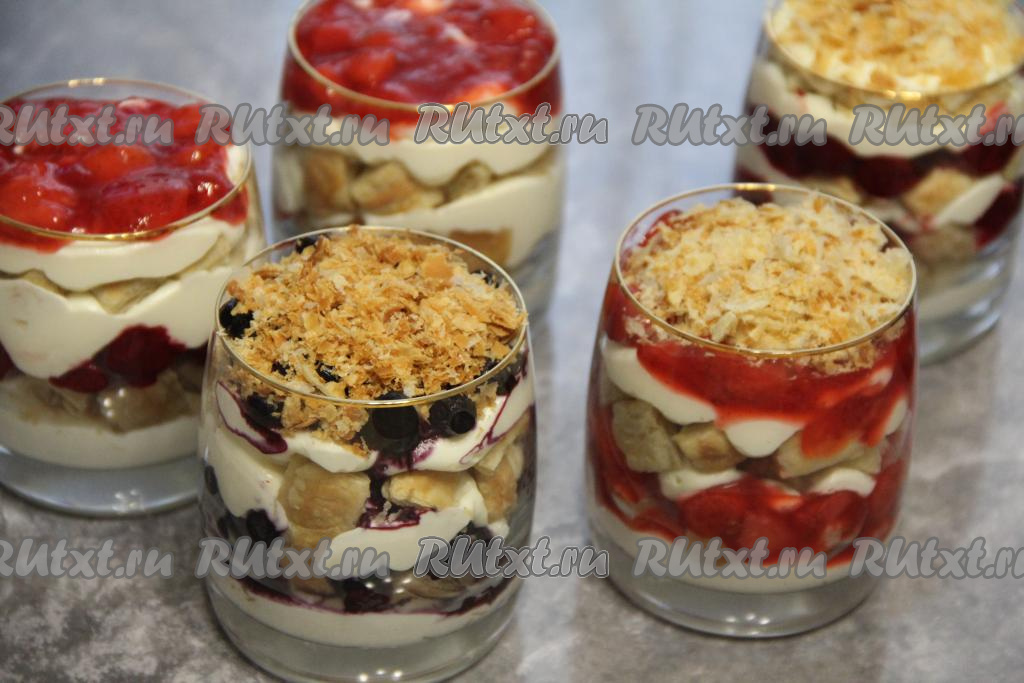 Трайфл - это пирожное-десерт в стаканчике. Стаканы для десерта можно взять стеклянные или одноразовые пластиковые. Предлагаю приготовить потрясающе вкусный, яркий ягодный трайфл. Его основу составляют слоёное тесто, ягоды и нежнейший крем из творожного сыра со взбитыми сливками. Для этого трайфла можно взять любые свежие или замороженные ягоды. Часть ягод я добавила целиком, а из части сварила конфи. Сформированный трайфл нужно обязательно оставить в холодильнике на пару часов для пропитки. Приготовьте такой десерт в стаканчиках и насладитесь его изысканным вкусом и ароматом! Из указанного количества ингредиентов получается 5 порций.