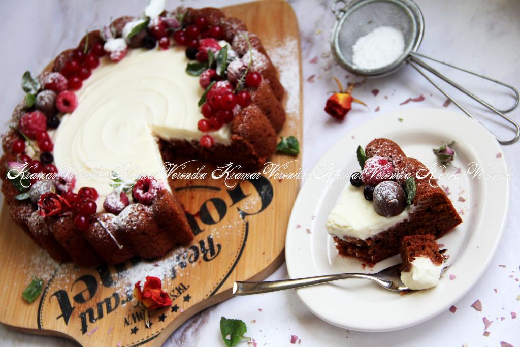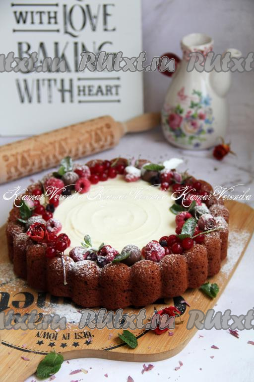 Готовый кекс достать из духовки, дать немного остыть. Затем вынуть свекольный кекс из формы и полностью остудить на решётке. Остывшую выпечку можно посыпать сахарной пудрой, а я решила кекс украсить кремом, перемешав с помощью лопатки 140 грамм творожного сыра и 1 столовую ложку сгущённого молока. Получившимся кремом смазала верх кекса. Края украсила ягодами и присыпала слегка сахарной пудрой. Вот такая красота получилась.