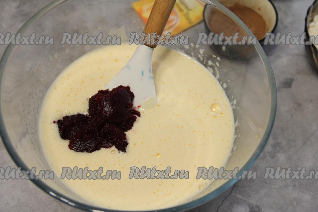 Добавить в яичную массу свекольное пюре и 2 столовых ложки растительного масла, перемешать лопаткой.