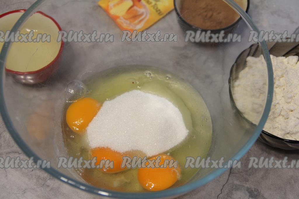 В глубокой миске соединить яйца и сахар.