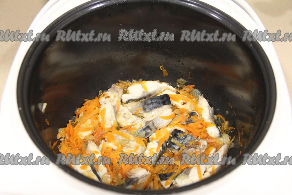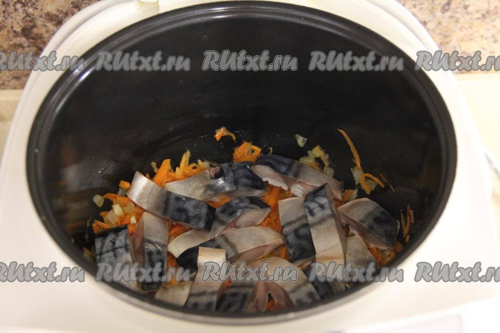 Кусочки филе скумбрии выложить поверх морковки с луком, посолить, аккуратно перемешать, выставить на 20 минут режим "Тушение" и закрыть крышку мультиварки.