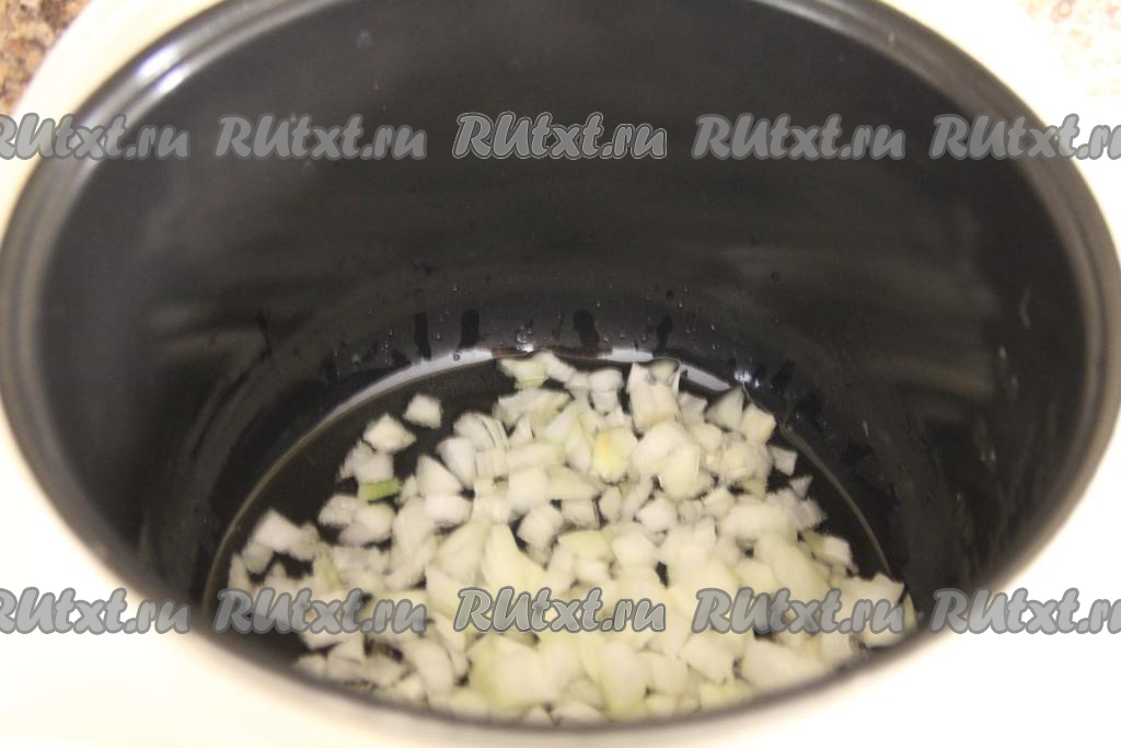 Лук и морковь почистить. Растительное масло влить в чашу мультиварки, выложить мелко нарезанный лук. Включить режим "Жарка", обжарить лук до прозрачности (я обычно обжариваю 4-5 минут), не закрывая крышку мультиварки и иногда помешивая.