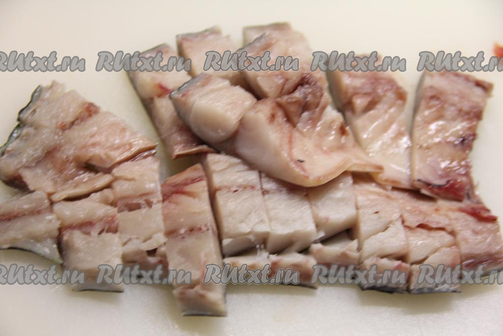 Разморозить скумбрию при комнатной температуре, после этого отрезать голову рыбы, хвост и плавники, разрезать брюшко, убрать из него внутренности и чёрную плёнку. Разделать скумбрию на филе, отделяя основную кость и мелкие косточки. Нарезать получившееся филе на средние кусочки.