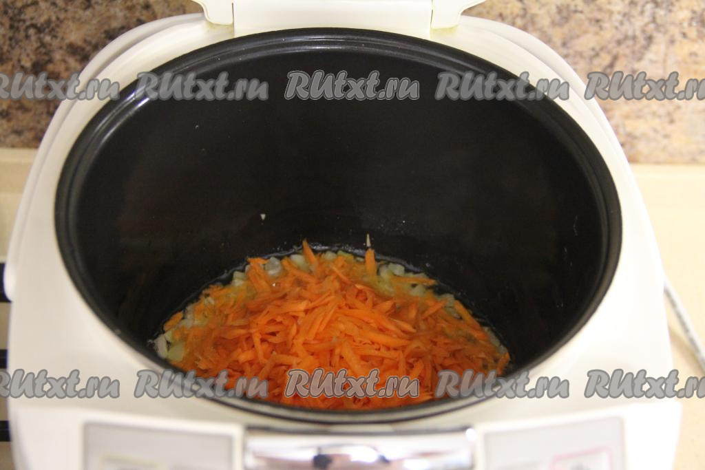 Морковь натереть на крупной тёрке и добавить в чашу мультиварки. Обжаривать овощи минут 5, периодически помешивая.