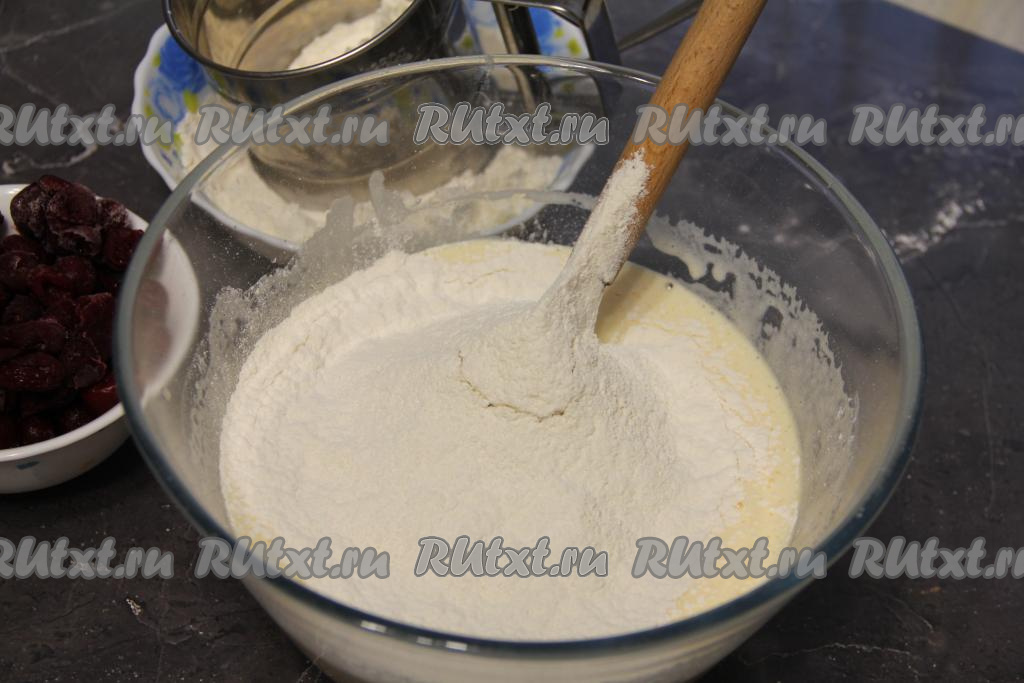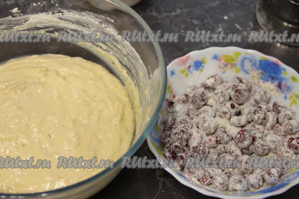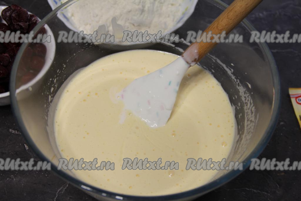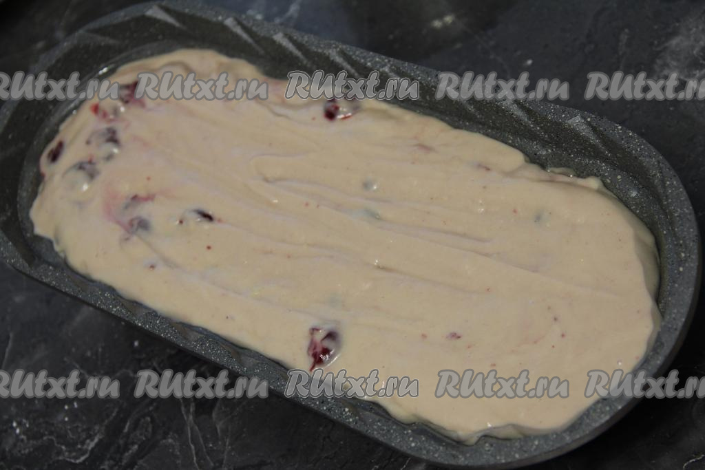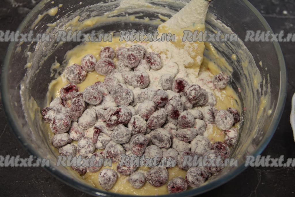Добавить вишню в тесто и перемешать, равномерно и аккуратно распределяя ягоды.