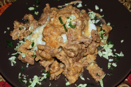 Бефстроганов из говядины, приготовленный по этому рецепту, получается очень нежным и вкусным. А картофельное пюре станет прекрасным дополнением к этому блюду.