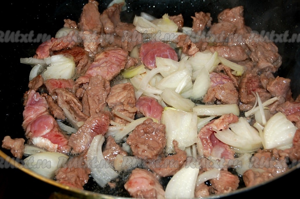 Говядину нарезать небольшими брусочками и выложить на разогретую сковороду с растительным маслом.