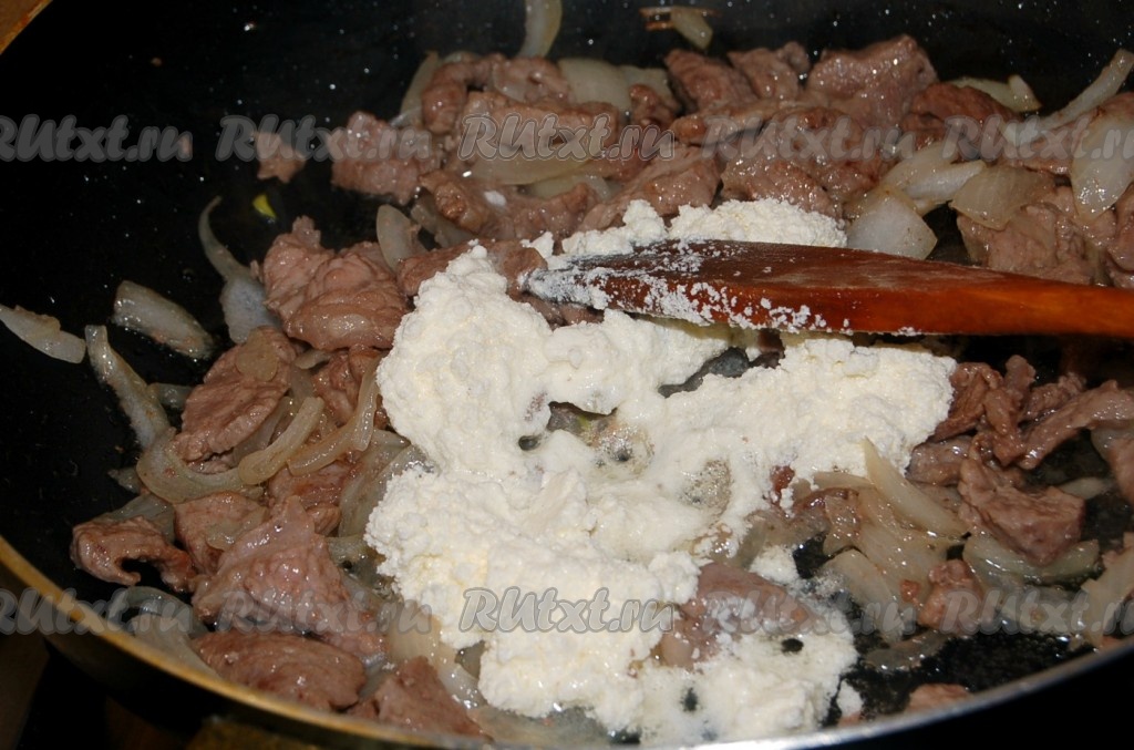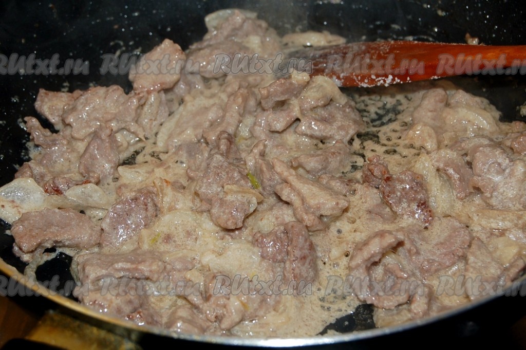 Тушить бефстроганов из говядины со сметаной, периодически помешивая, 30-40 минут на небольшом огне.