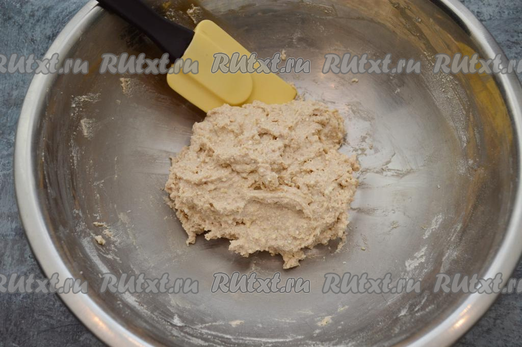 Затем по столовой ложке начать добавлять муку, вмешивая её в творожную массу с помощью лопатки. Муки может потребоваться больше или меньше, всё зависит от влажности творога и размера яйца. Смотрите на консистенцию теста, оно должно быть не забитым мукой, немного влажным, но при этом держаться на лопатке. Мне потребовалось 3 столовых ложки муки.