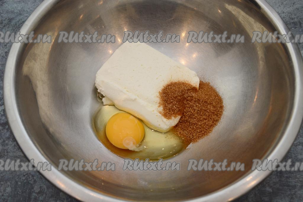 В глубокую миску выложить творог, сырое яйцо и смесь сахара с корицей.