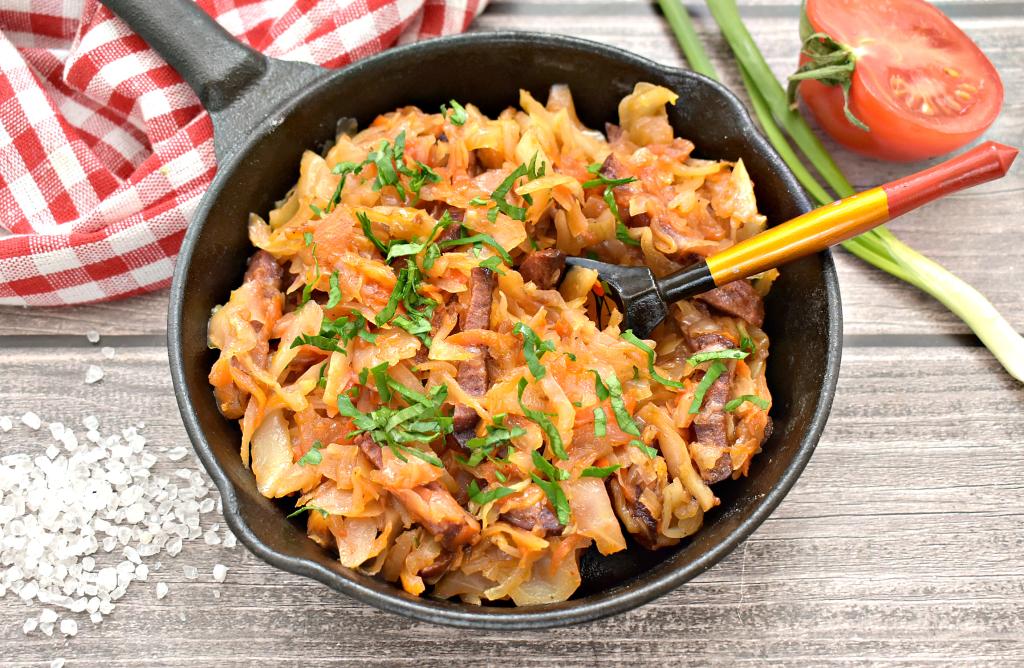 Капуста, тушёная с копчёной колбасой, получилась сочной, вкусной и сытной, при подаче это блюдо можно посыпать измельчённой зеленью.