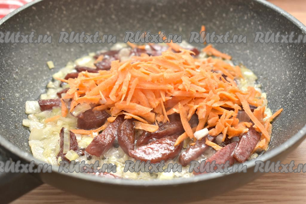 Далее к колбасе и луку выкладываем натёртую на крупной тёрке морковку, перемешиваем и обжариваем, помешивая, 4-5 минут (до мягкости моркови).