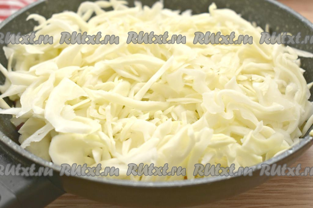 Затем к овощам и колбасе выкладываем нарезанную капусту.