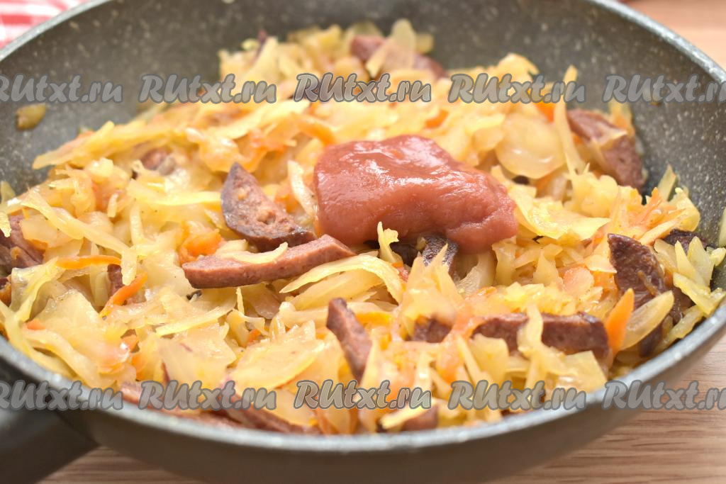 Доводим до кипения, убавляем огонь. Тушим капусту с копчёной колбасой под крышкой 20 минут (если капуста молодая, достаточно 15 минут). Пару раз во время тушения капусту перемешиваем. Спустя 20 минут добавляем к капусте томатную пасту.