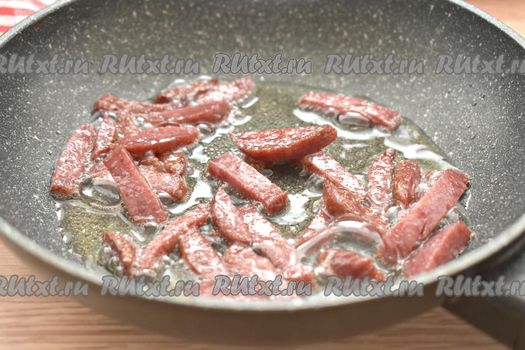 Разогреваем на сковороде растительное масло, выкладываем нарезанную копчёную колбасу и, периодически перемешивая, обжариваем её на среднем огне 2 минуты.