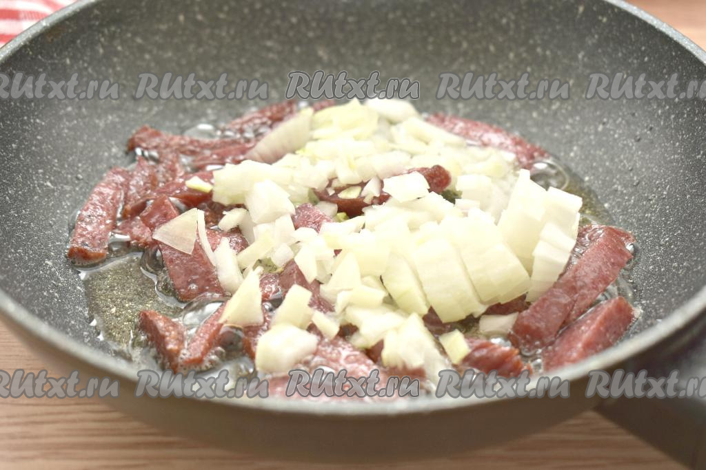 К обжаренной колбасе выкладываем достаточно мелко нарезанный лук, перемешиваем, обжариваем 2-3 минуты, не забывая иногда помешивать.