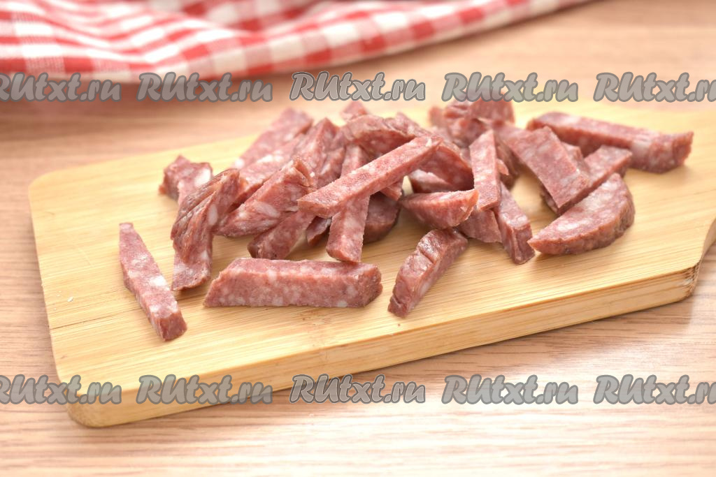 Копчёную колбасу нарезаем на небольшие брусочки. Лук и морковь очищаем.