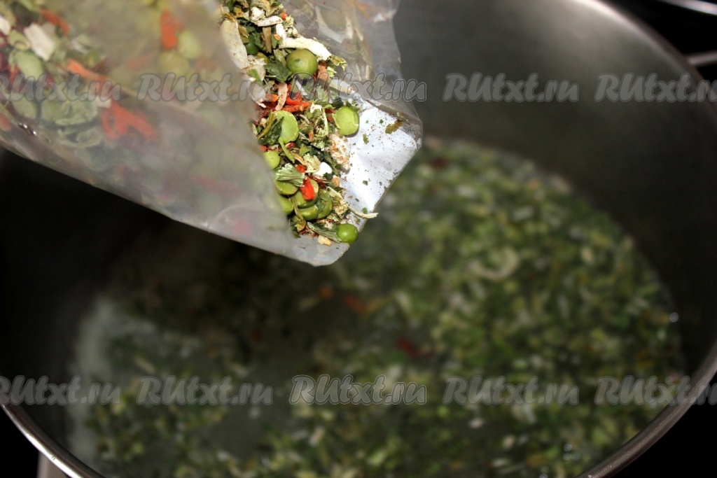 Зелёный горох в супах не только преображает вид блюда, но и делает вкус супа более нежным, быстрее разваривается по сравнению с привычным желтым. Предлагаю рецепт супа с зёленым горошком, приготовленным на основе куриного бульона и из готовой овощной смеси коллекции Юлии Высоцкой (без ГМО, без усилителей вкуса и консервантов). В готовую смесь входят сушеные овощи - морковь, лук репчатый, сельдерей, паприка, шпинат, специи молотые - кориандр, тмин.