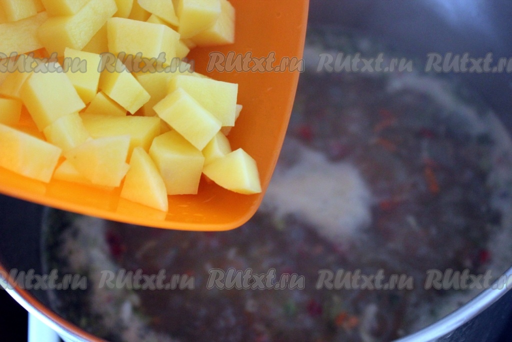 Варить примерно пол часа на среднем огне и затем добавить картофель, нарезанный кубиками.