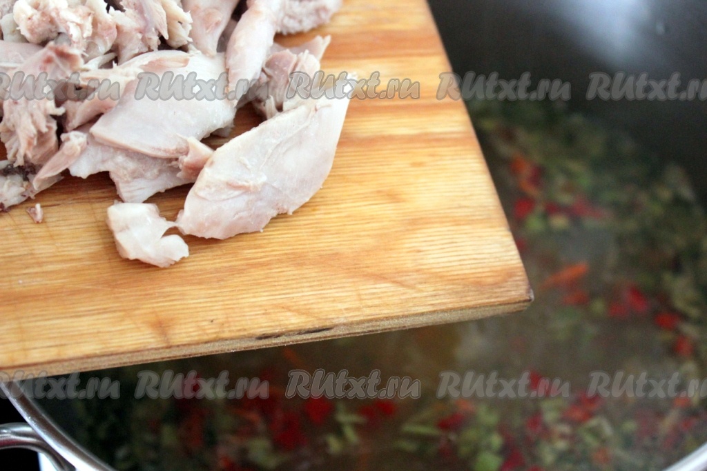 Куриное мясо отделить от костей, порезать и вернуть в суп. Варить до желаемой степени мягкости и разваренности гороха.