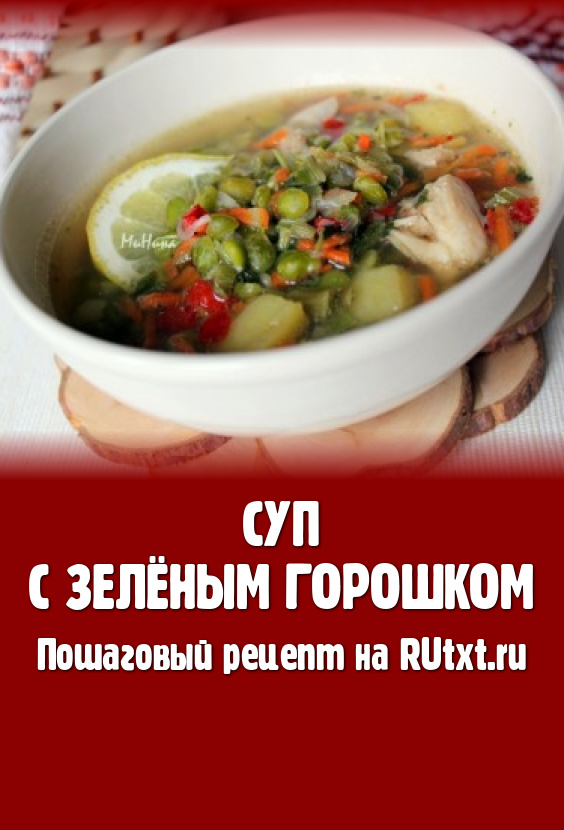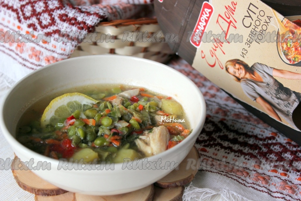 Сварить куриный бульон из воды и куриных бёдер (бедра залить холодной водой и варить 30 минут), бульон процедить, снова довести до кипения и высыпать в него смесь "Суп из зелёного гороха".