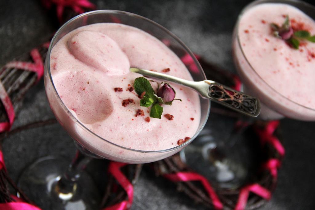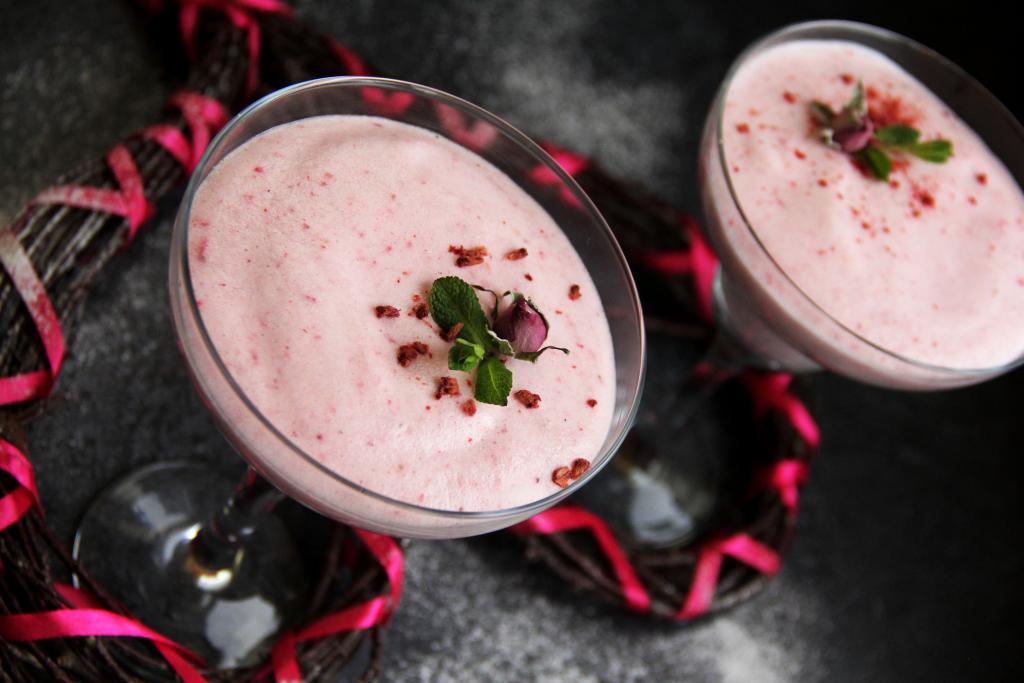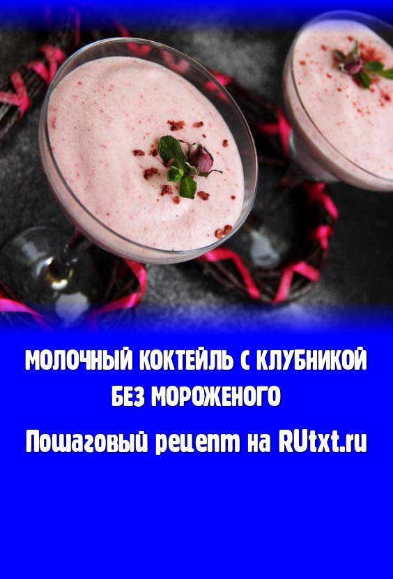 Воздушный, вкусный, нежный молочный коктейль, приготовленный с клубникой без добавления мороженого, разложить по плоским бокалам и сразу подать к столу.