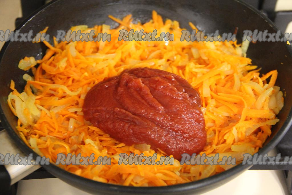 Обжаривать овощи минут 10 (до мягкости моркови), иногда помешивая. Затем добавить томатную пасту, перемешать, посолить по вкусу, перемешать.