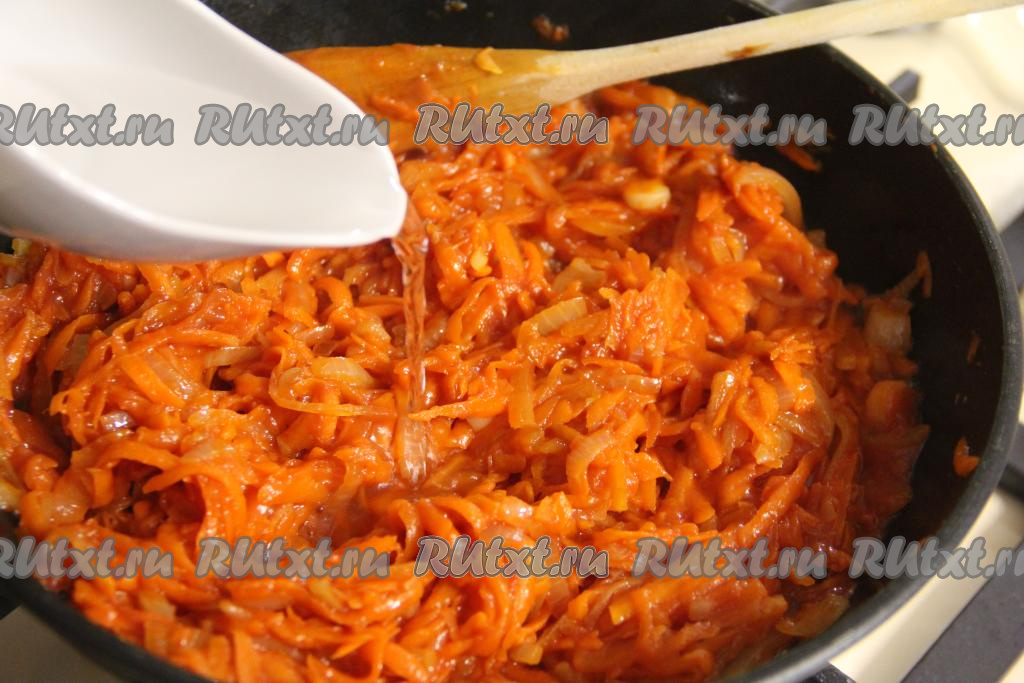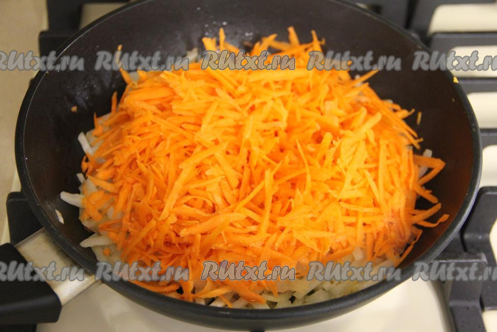 Морковь натереть на крупной тёрке, добавить к обжаренному луку, перемешать.