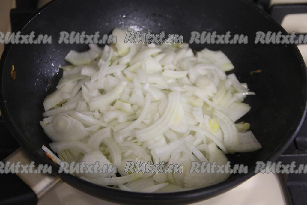 В сковороде прогреть растительное масло, выложить лук, нарезанный на полукольца, обжарить его на растительном масле в течение 5-6 минут (до прозрачности) на среднем огне, периодически помешивая.