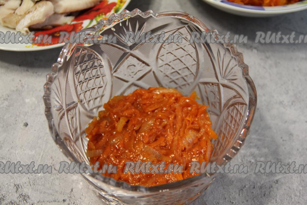 Таким образом собрать слоями рыбу под маринадом, чередуя слои лука с морковью и хека. Поставить салатник с закуской в холодильник, как минимум, на 3-4 часа.