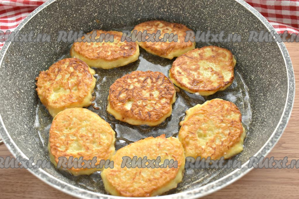 Вливаем на сковороду растительное масло и разогреваем его. На хорошо разогретую сковороду выкладываем по 1 столовой ложке картофельного теста, формируя круглый (или овальный) оладушек.