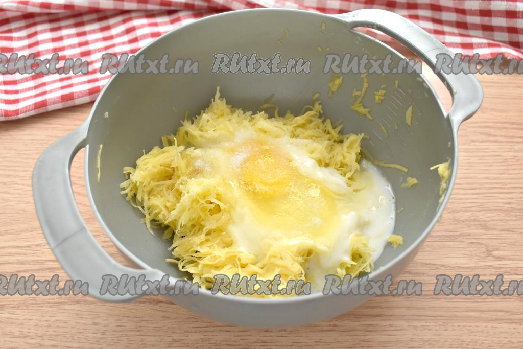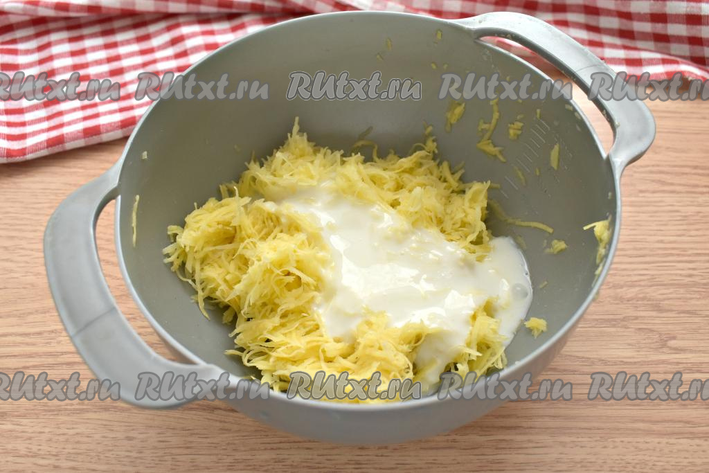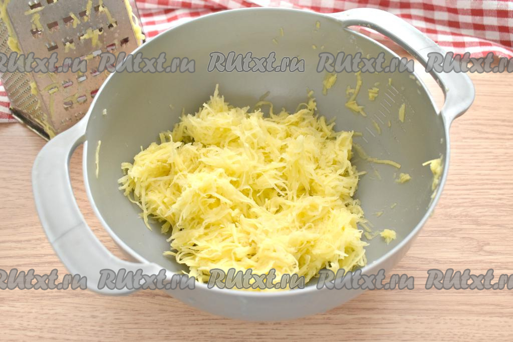 Картофель очищаем, ополаскиваем холодной водой, натираем на средней тёрке. Отжимаем от лишней жидкости получившуюся картофельную массу (я отжимаю руками).