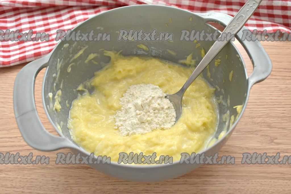 В картофельную массу добавляем по 1 столовой ложке муки, тщательно вмешивая её в тесто. Добавляя муку, важно ориентироваться на густоту замешиваемого картофельного теста.