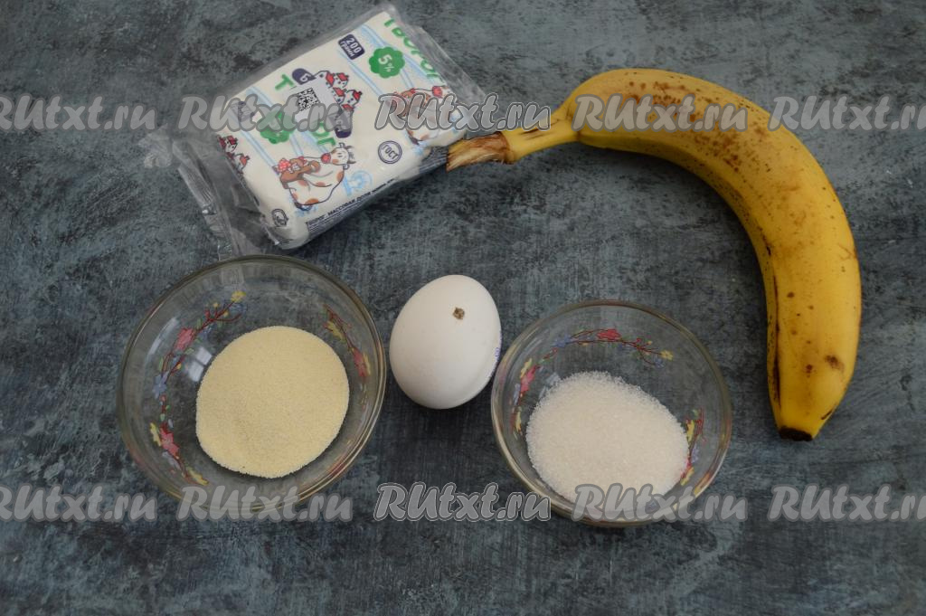 Подготовить продукты. Творог можно взять любой жирности. Банан желательно взять спелый или даже немного переспелый.