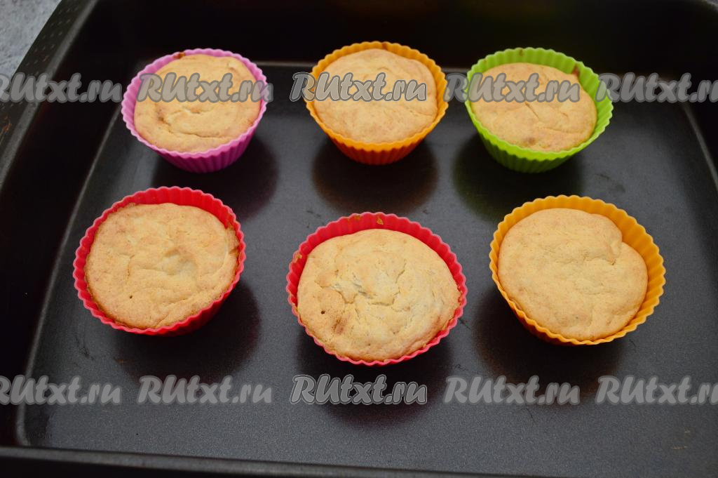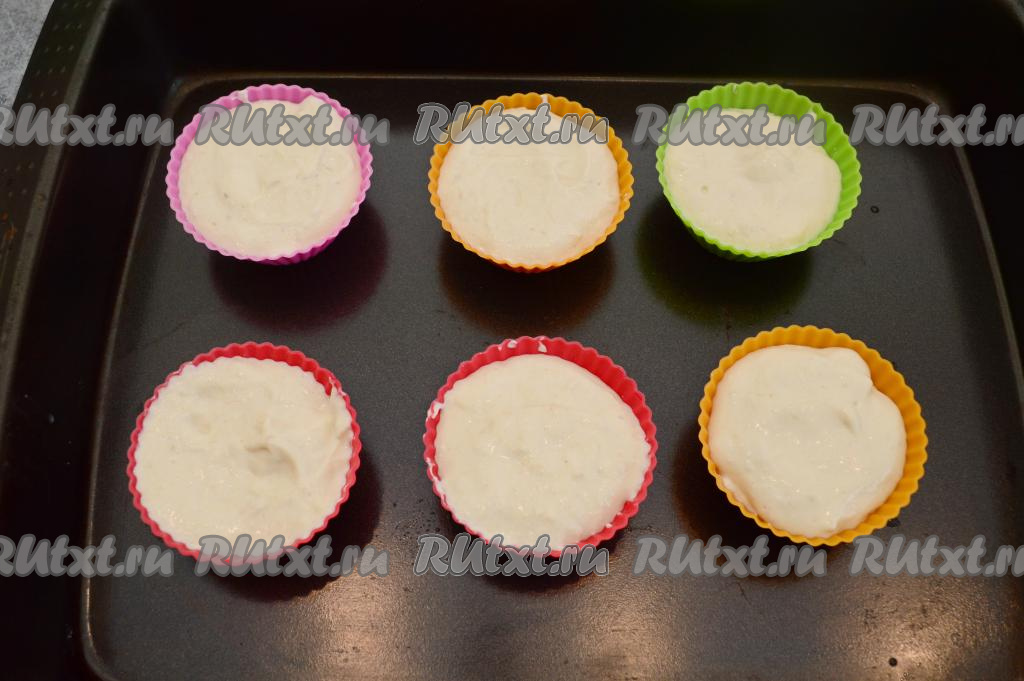 Разложить творожно-банановое тесто по формочкам, заполняя их практически до верха (буквально немного не доходя до бортиков формы). Я использовала силиконовые формы для маффинов, предварительно их маслом не смазывала. Если у вас формы металлические, тогда обязательно промажьте их небольшим количеством растительного масла, чтобы готовое суфле легко отделялось от формы.