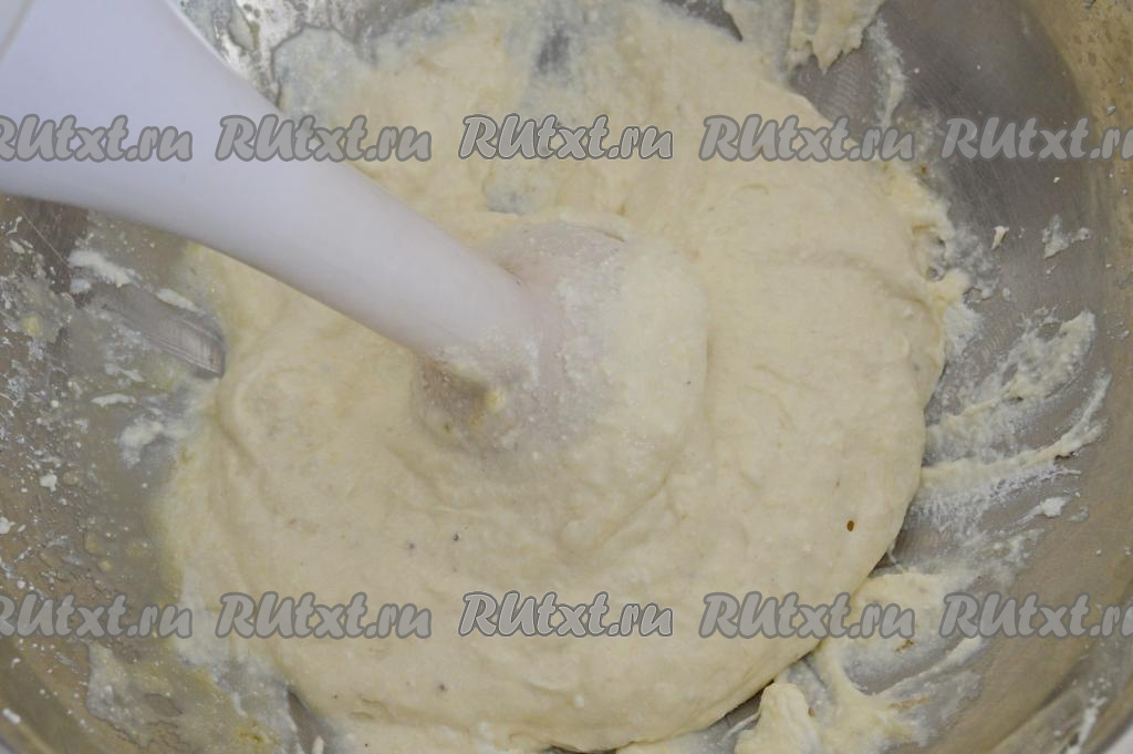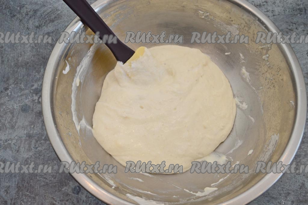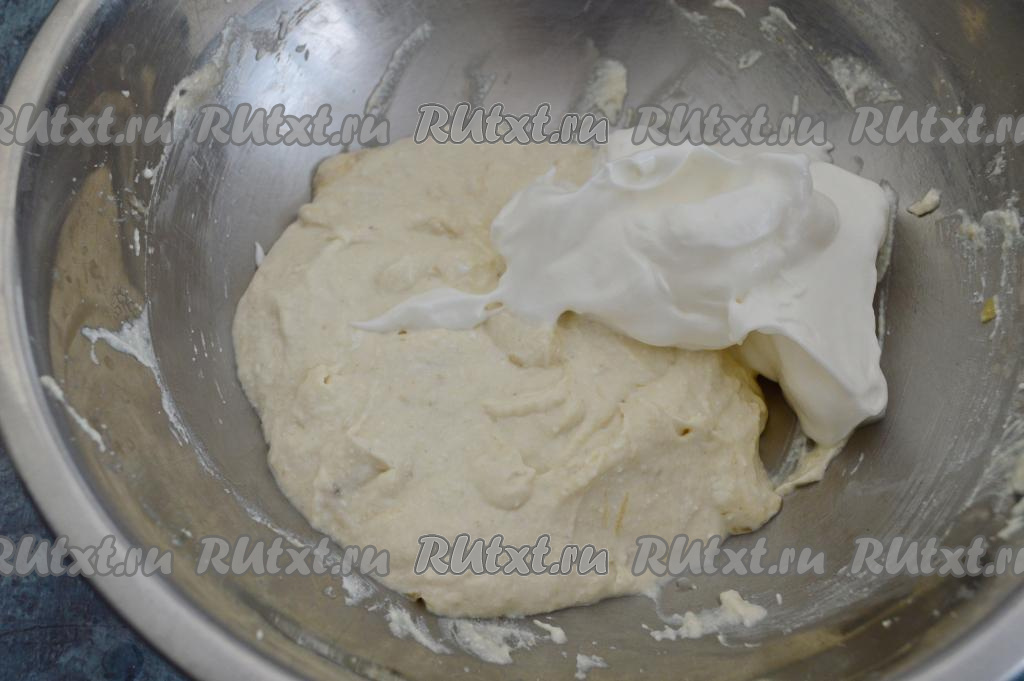 Аккуратно при помощи лопатки движениями снизу вверх вмешать яичный белок в творожно-банановую массу. Тесто для суфле получится однородным, воздушным, не густым.