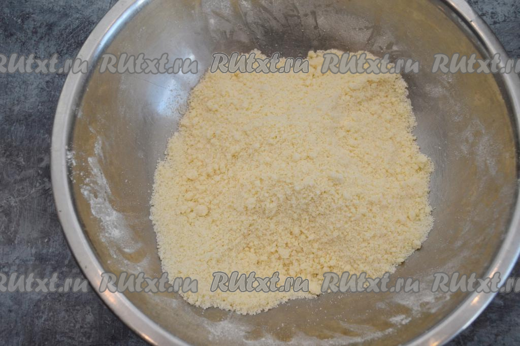 Руками перетереть масло с сухими ингредиентами до образования мелкой, однородной песочной крошки.