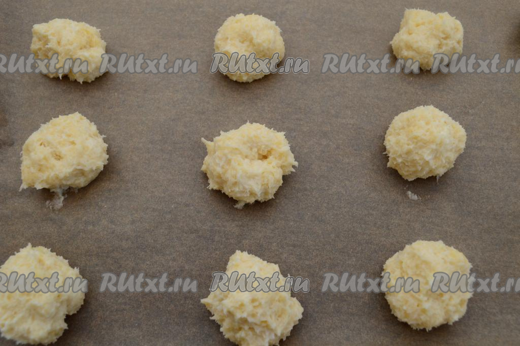 Руками сформировать круглые заготовки печенья размером с грецкий орех (у меня получилось 16 штук) и на небольшом расстоянии друг от друга выложить их на противень, застеленный пергаментом.