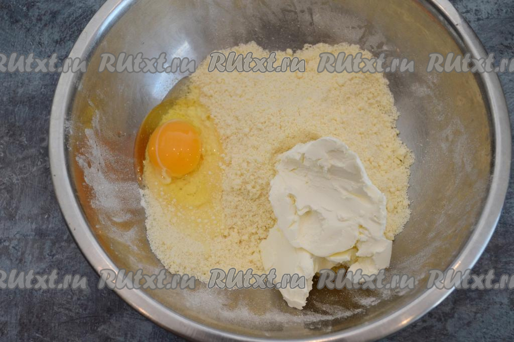 В миску с крошкой выложить творожный сыр и сырое яйцо.