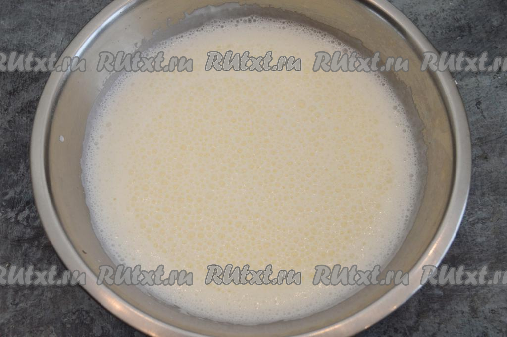 В запенившийся кефир всыпать сахар и соль, добавить сырое яйцо, перемешать массу венчиком. Она хорошо запенится и будет вся покрыта симпатичными пузырьками.