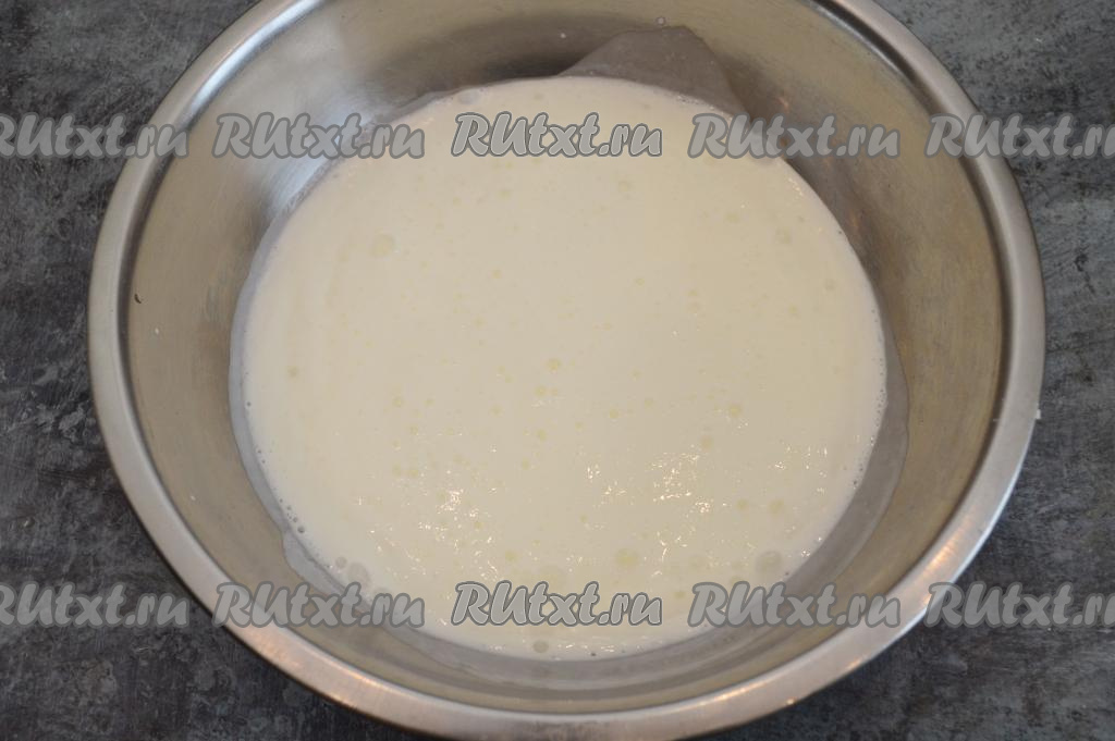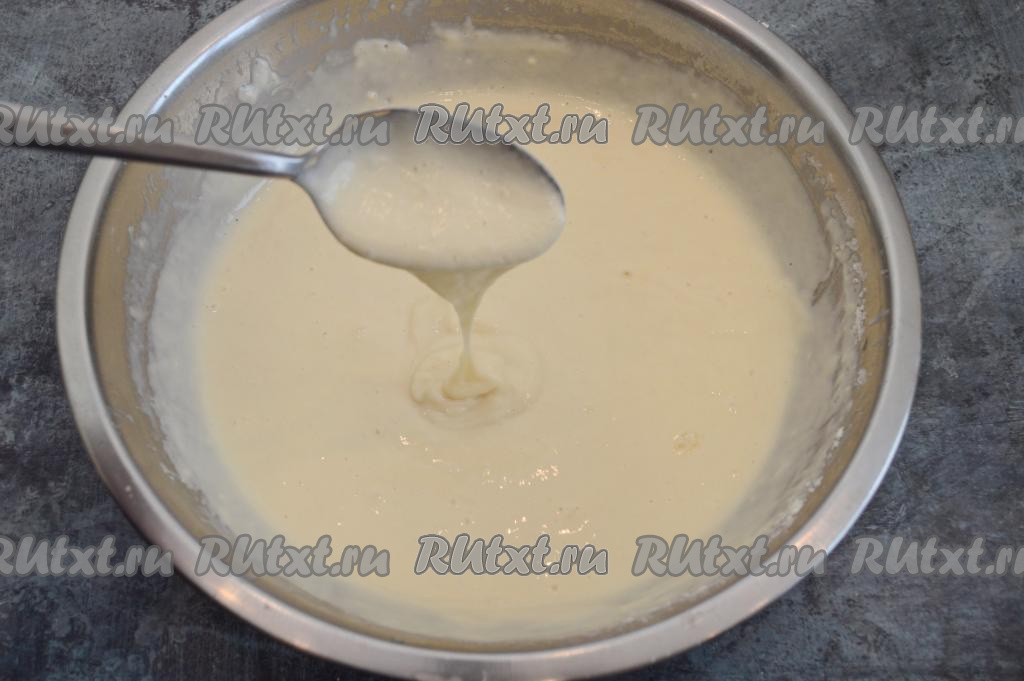 Аккуратно столовой ложкой (или венчиком) перемешать получившуюся массу, замешивая блинное тесто. Оно будет достаточно тягучим, напоминающим по консистенции густой кефир. Тесто с ложки будет стекать лентой.